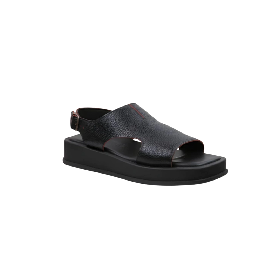 A sandália feminina em couro legítimo preto combina linhas modernas e solado robusto, criando um visual elegante e contemporâneo.